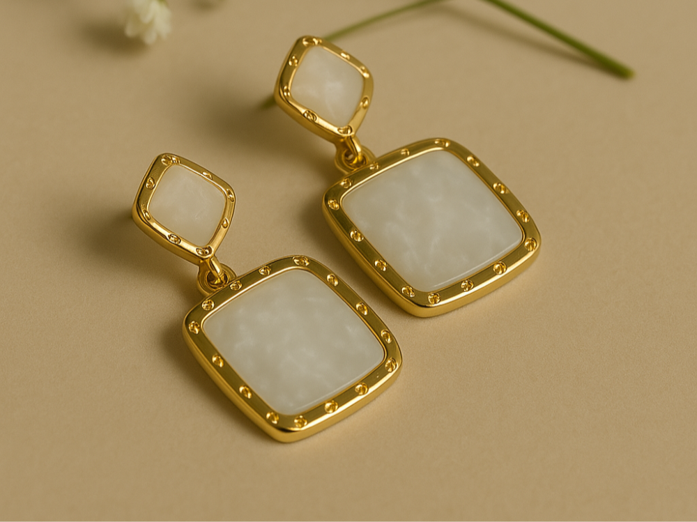 Veshoo Stylish Golden Korean Pearl Rectangle Earrings – Unique Zinc Drop & Dangler for Women, Anti-Tarnish Finish