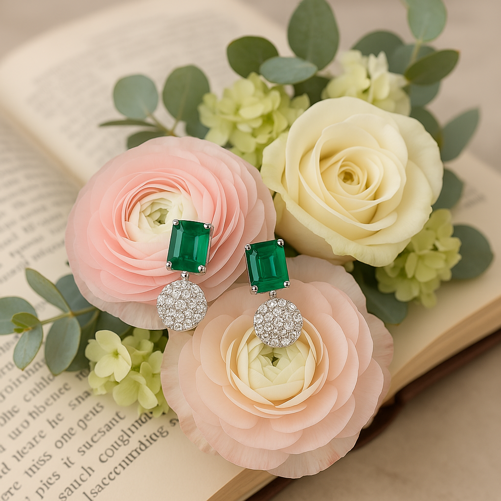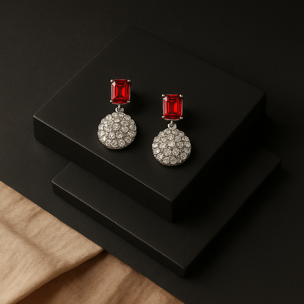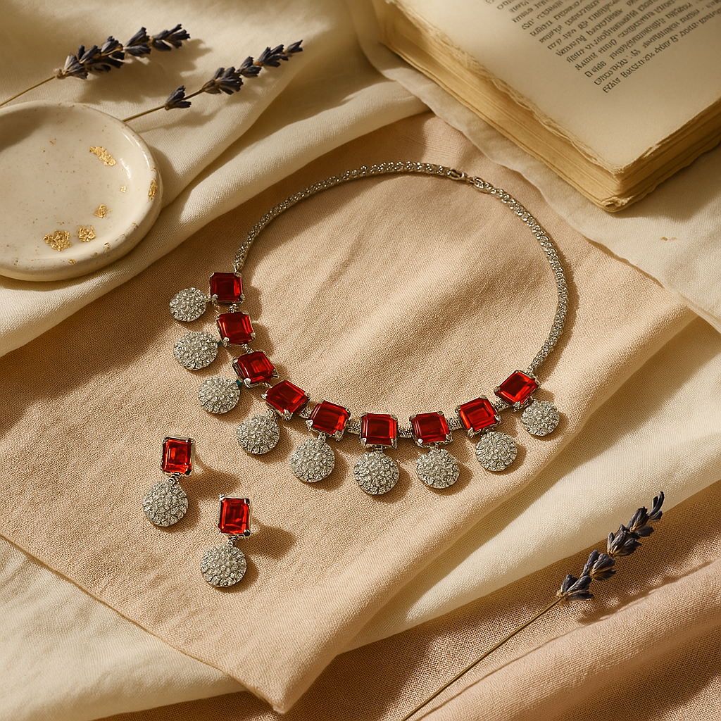 Elevate your elegance with the Veshoo Crystal Crown Square Stone Necklace Set, a stunning fusion of structure and sparkle. Featuring bold square-cut stones in vibrant colors, each accented with shimmering American diamond-studded circles, this set brings modern glamour with a regal twist.