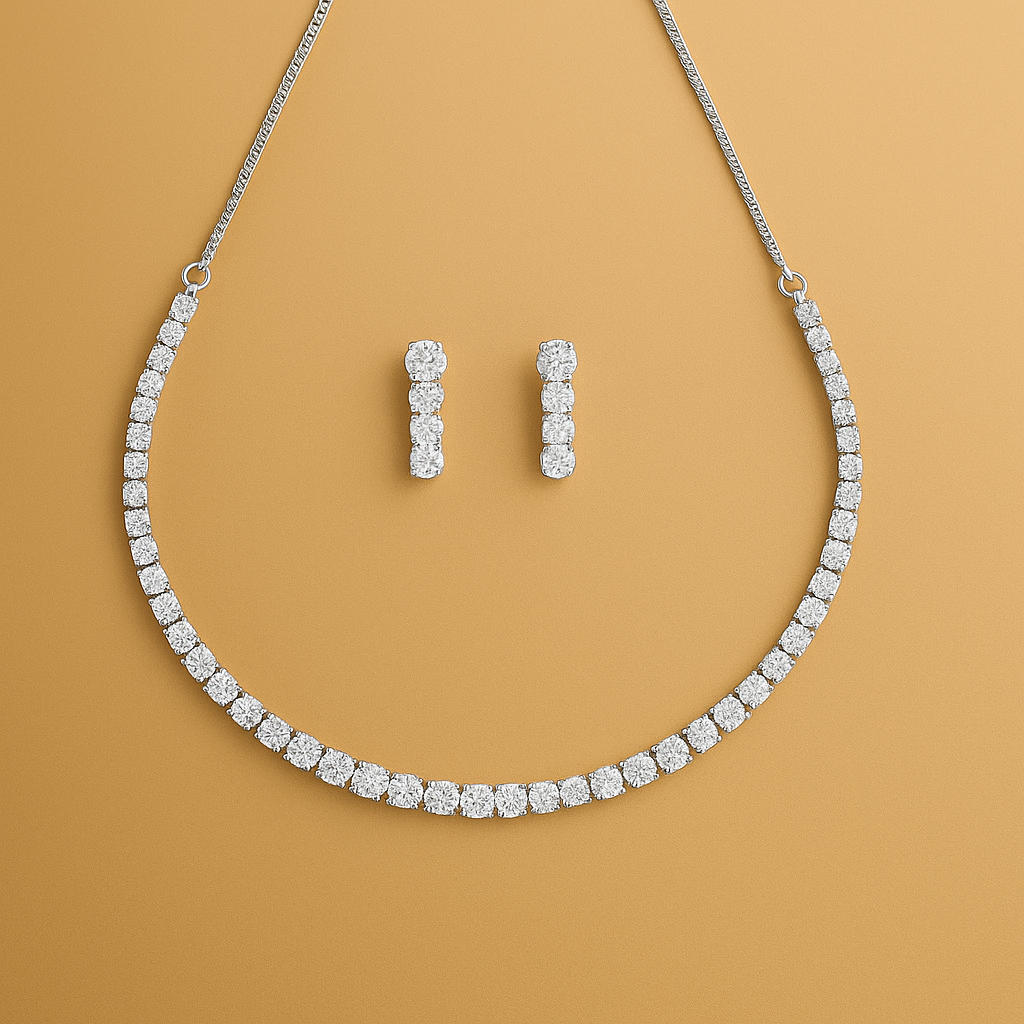 Elevate your elegance with this handcrafted White American Diamond (AD) Solitaire Necklace Set, perfect for both women and girls. Designed in a timeless style, this set features high-quality CZ (Cubic Zirconia) stones that emulate the brilliance of real diamonds. The necklace and matching earrings are crafted on a durable silver-copper alloy base, finished with a rhodium-plated silver tone for long-lasting shine and anti-tarnish protection.